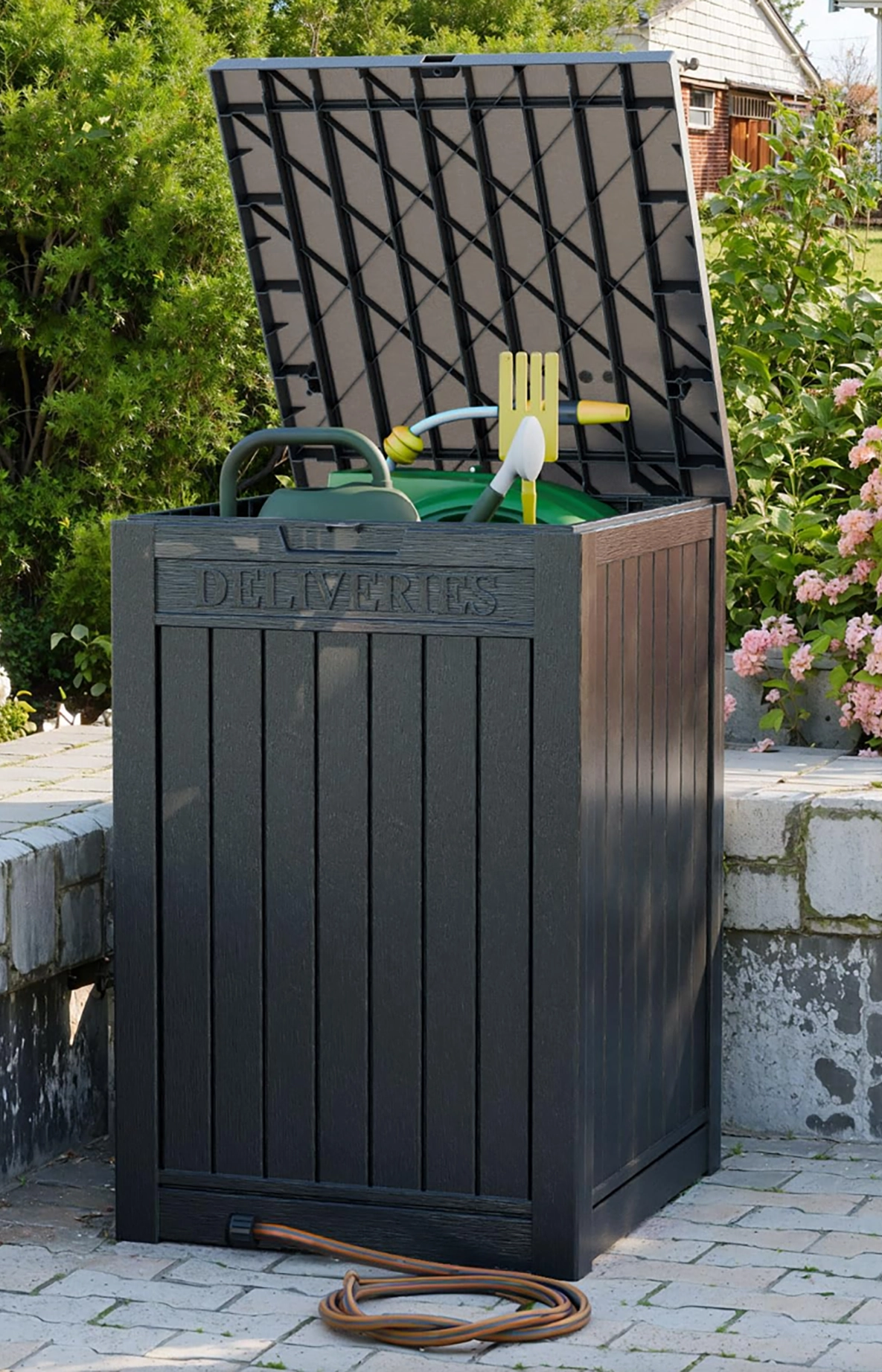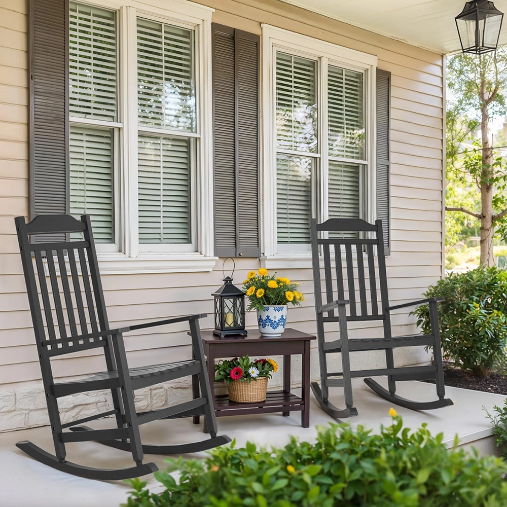Durable all-weather rocking chair with high back and armrests, perfect for relaxing on the porch, lawn, or garden. Classic comfort meets outdoor style.